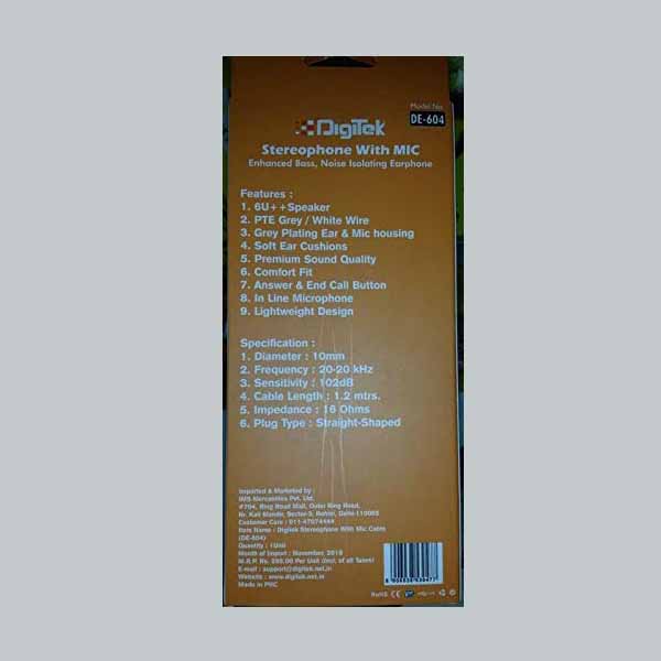 DIGITEK HI-FI Sound Earphone with MIC 1.2 MTR Length