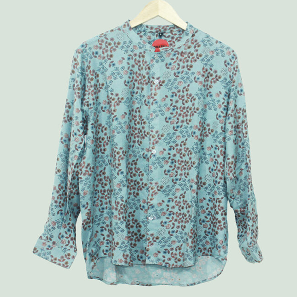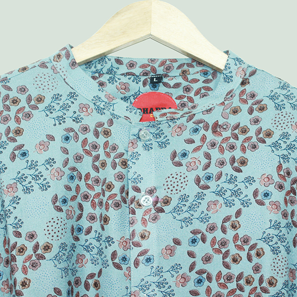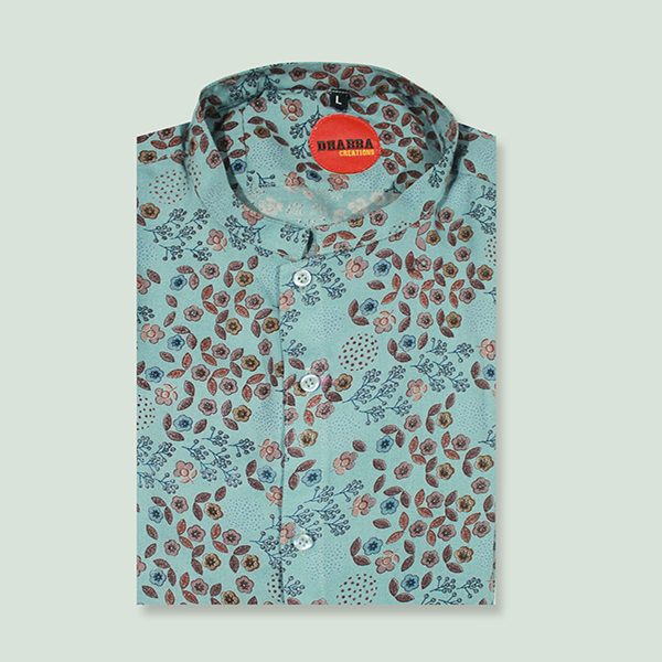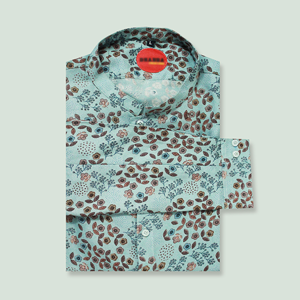 The cooling aqua blue background of this shirt woven in south cotton fabric is the ultimate buy. The unique pattern of flowers represents the ferns of the land and the ferns of the sea.